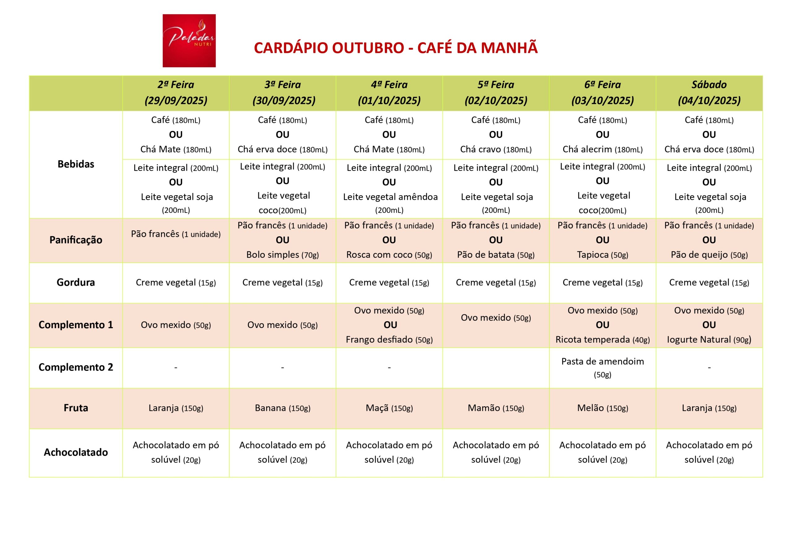 CARDÁPIO CAFÉ DA MANHÃ – 29.09 a 04.10.25